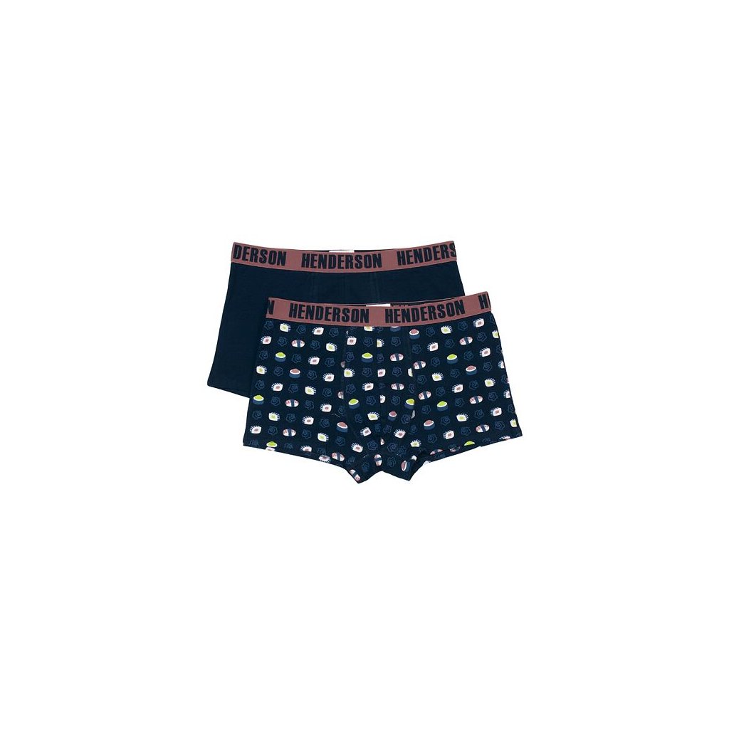 Pánské boxerky jsou balené v dárkové krabičce po 2 kusech, mají modrou barvu a jsou zdobené logem značky Henderson.