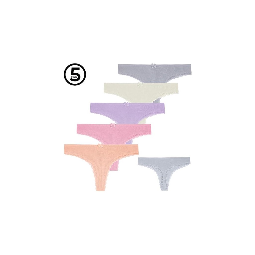 Tanga jsou vyrobená z prodyšné bavlny s příměsí, mají ozdobné lemy a jsou v multibalení po 5 kusech.