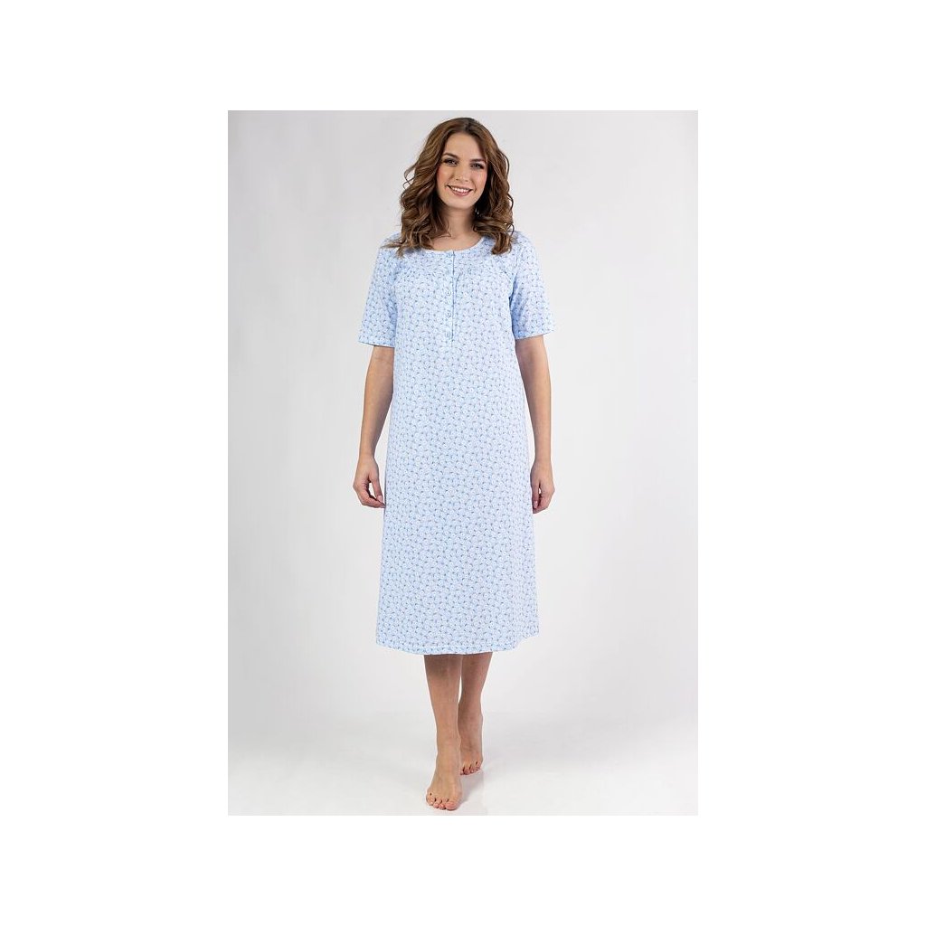 Dámská noční košilka je vyrobená s krásným květinovým vzorem, má modro-bílou barvu a je dlouhá.