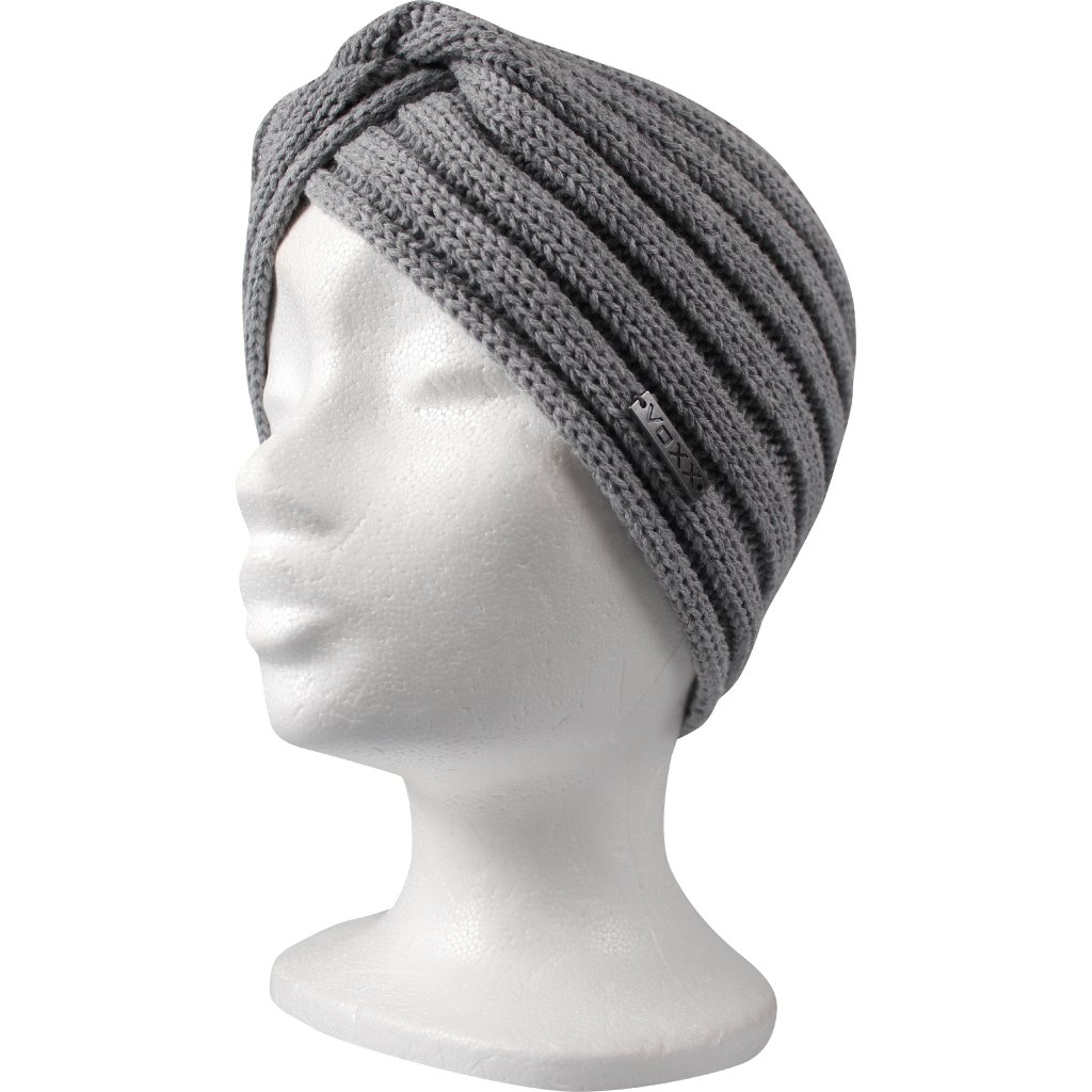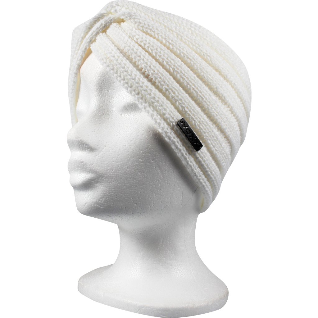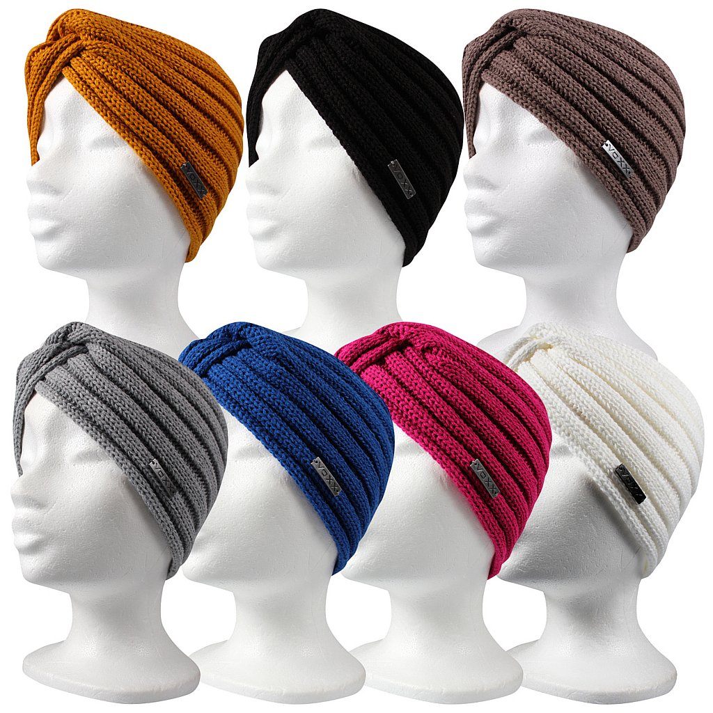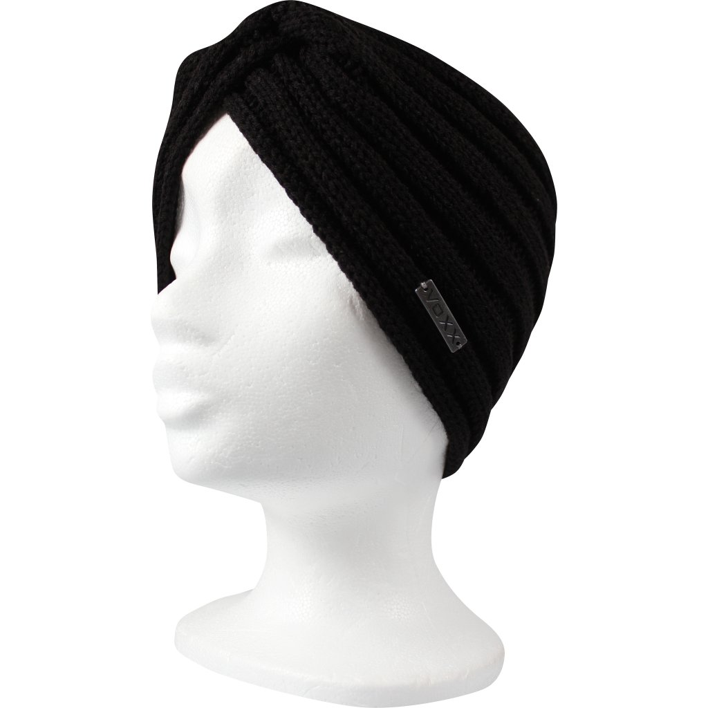 - dámská elegantní pletená čelenka s přetočením na přední straně, zdobená kovovým štítkem VoXX