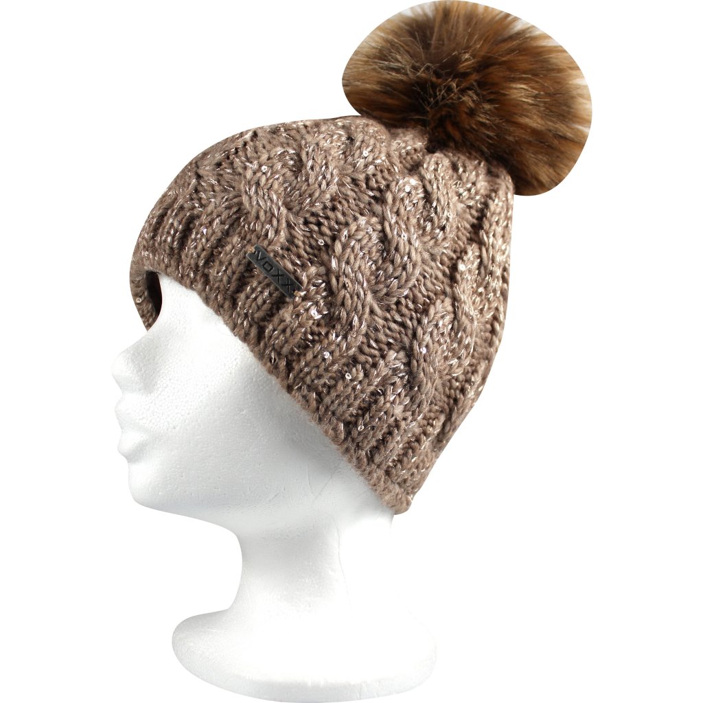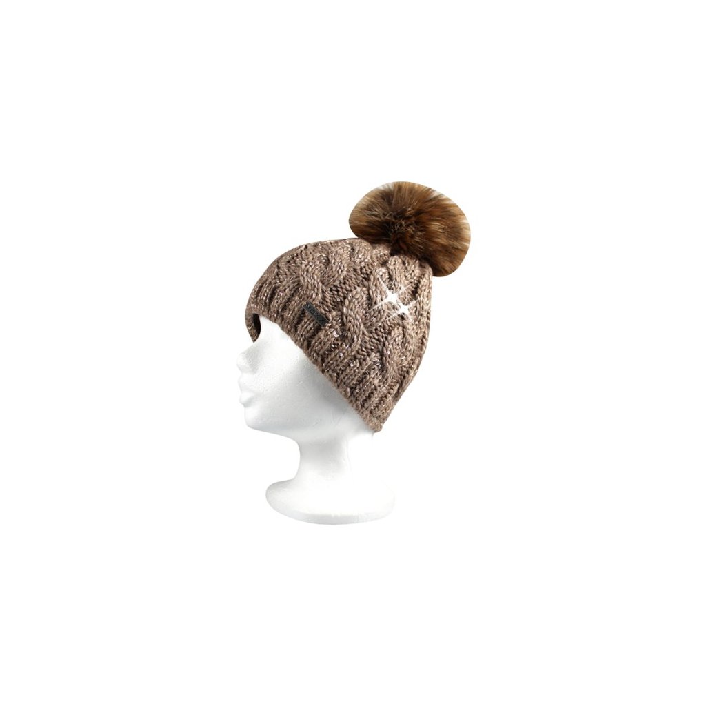 Čepice dámská pletená ASTRA s flitry a bambulí HNĚDÁ