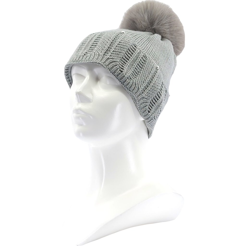 Čepice dámská zdobená pletená REXTONA s viskózou, bambulí SVĚTLE ŠEDÁ