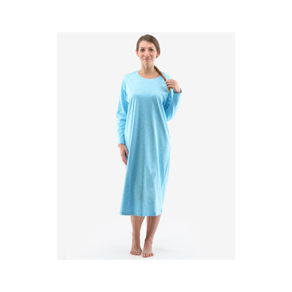 košilka noční dámská dlouhý rukáv, šité, s potiskem značky GINA, kód 19131. Barva: sv. tyrkysová azurová, Velikost: L, Složení: 100% BavlnaZákladem kvalitního spánku je vaše pohodlí, ke kterému vám pomůže i pohodlné noční prádlo. Naše dámská noční košilka s dlouhým rukávem je ideální volbou pro každou milovnici volných střihů a kvalitních materiálů. Noční košilka je dlouhá, má decentní vzor vážek, nikde neškrtí a materiál ze 100% bavlny vám zajistí pohodlí po celou noc. Bude se vám v ní spát doslova jako v bavlnce.. Kolekce: Pyžama 2022