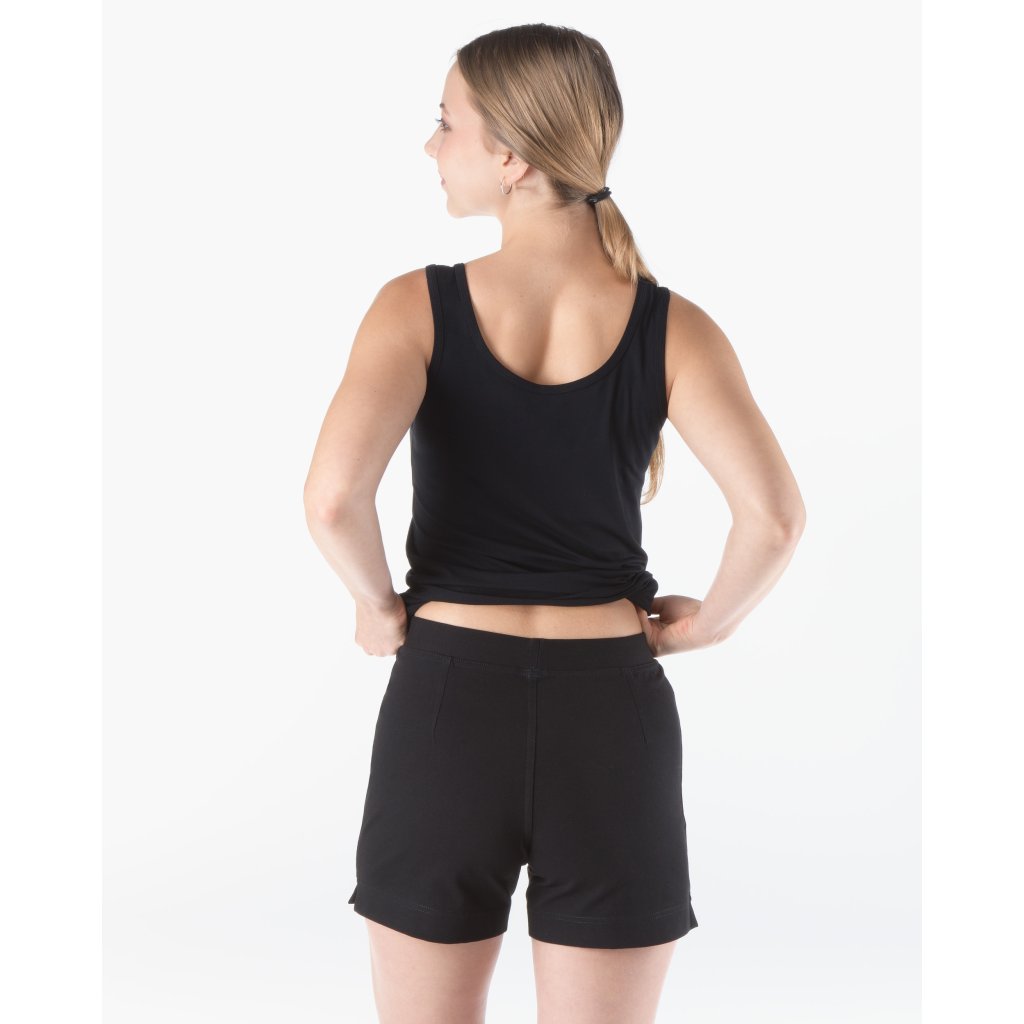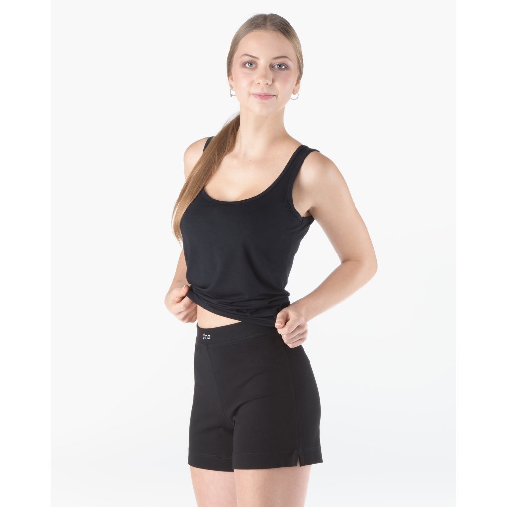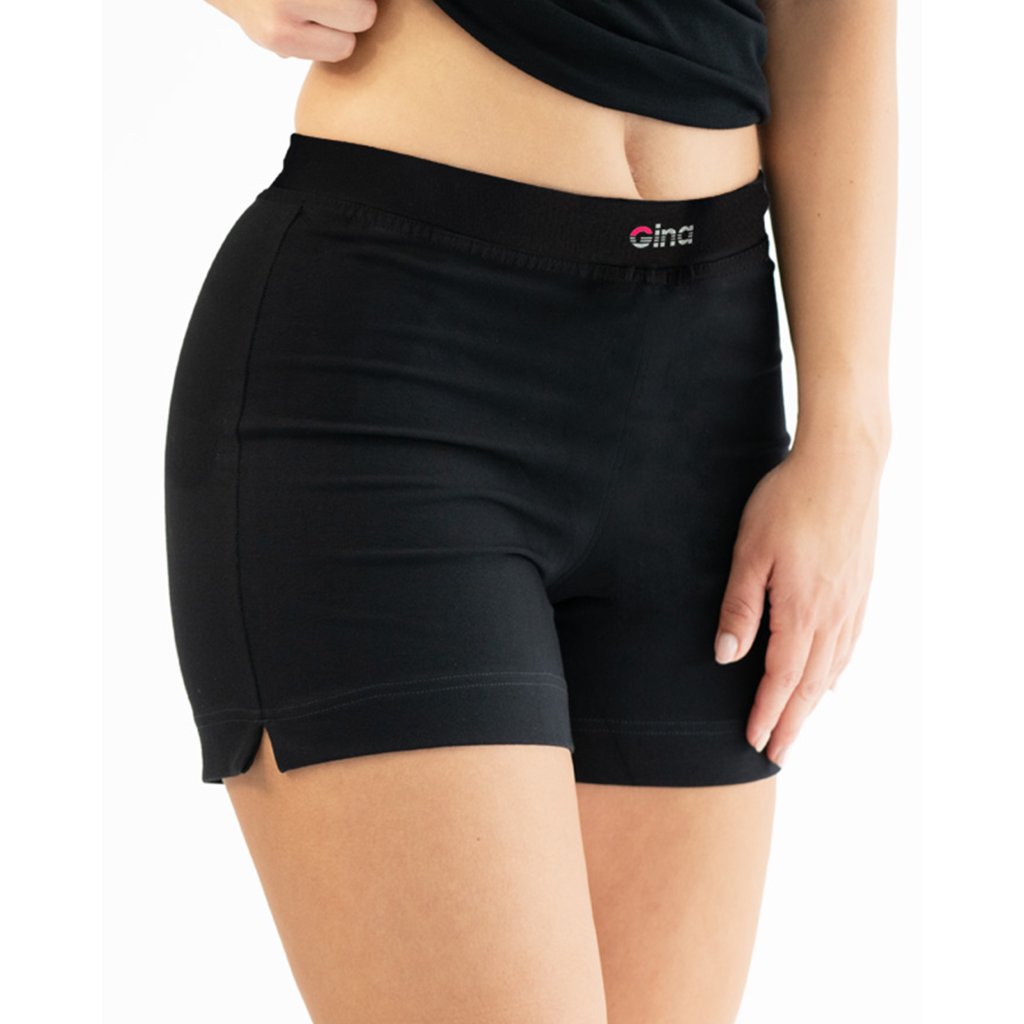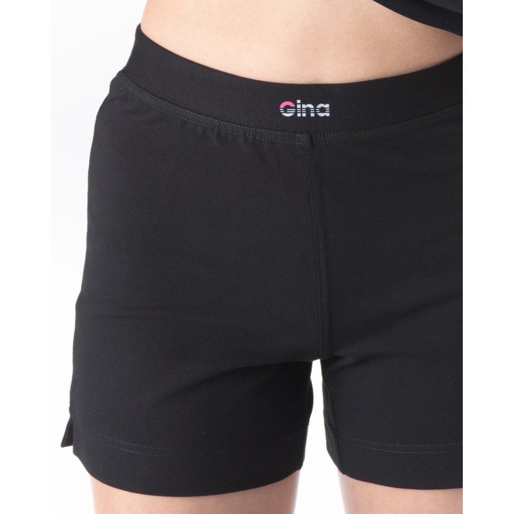 Šortky volnějšího střihu s rozparky na nohavicích, dámské šité sportovní prádlo. V pasovém kraji je zašitá pruženka a našité logo GINA. Šortky jsou jednobarevné. Materiál je vyroben z bavlny, která je doplněna elastanem. Úplet je vhodný pro všechny, kteří hledají přírodní materiály. Elastan přidává materiálu pružnost a zlepšuje jeho tvarovou stálost. Prádlo z tohoto materiálu je vhodné pro každodenní nošení.