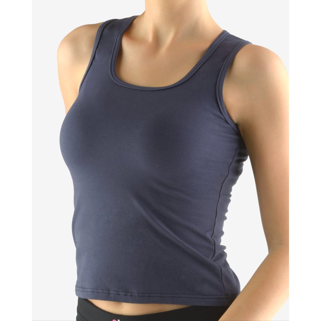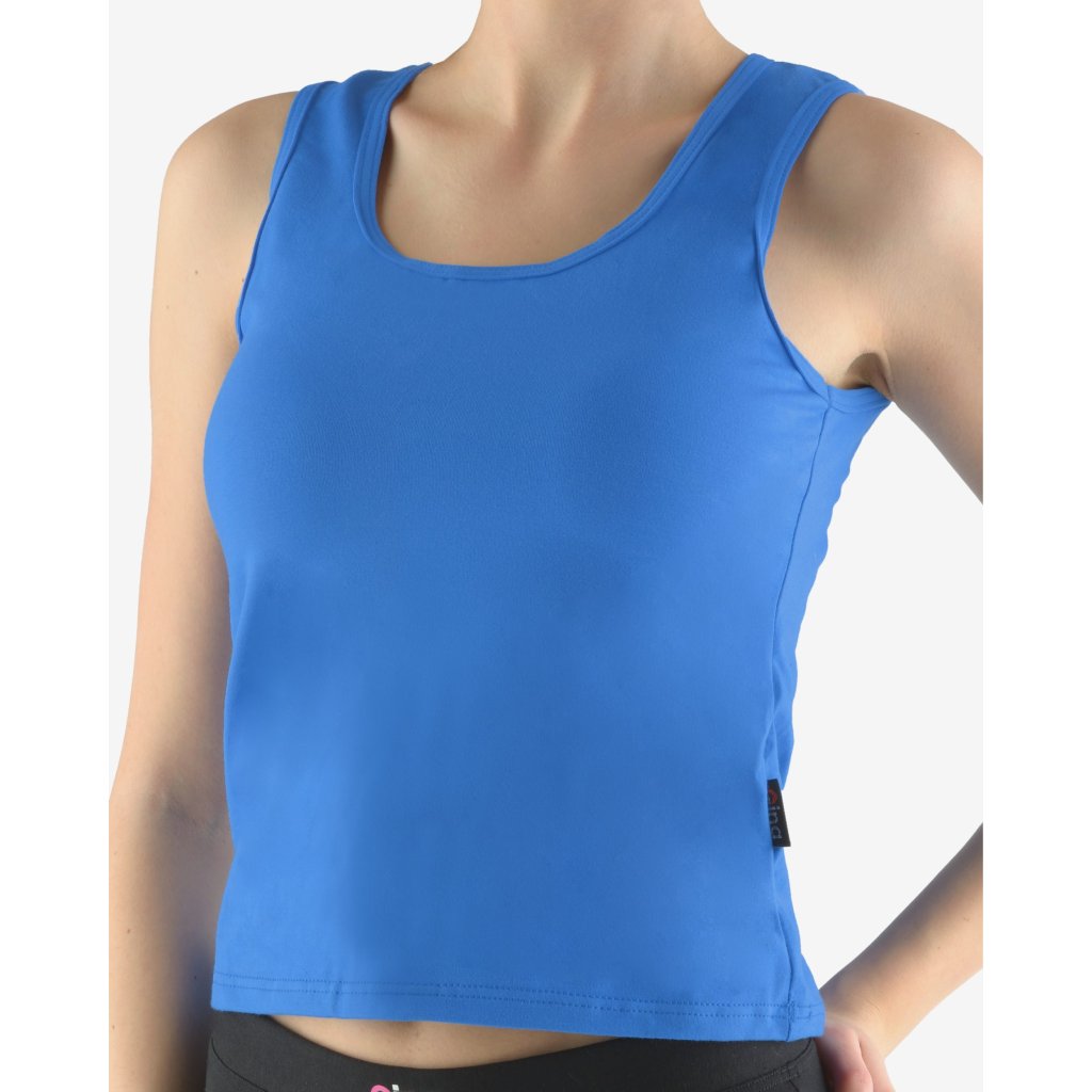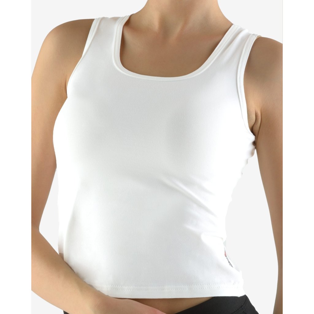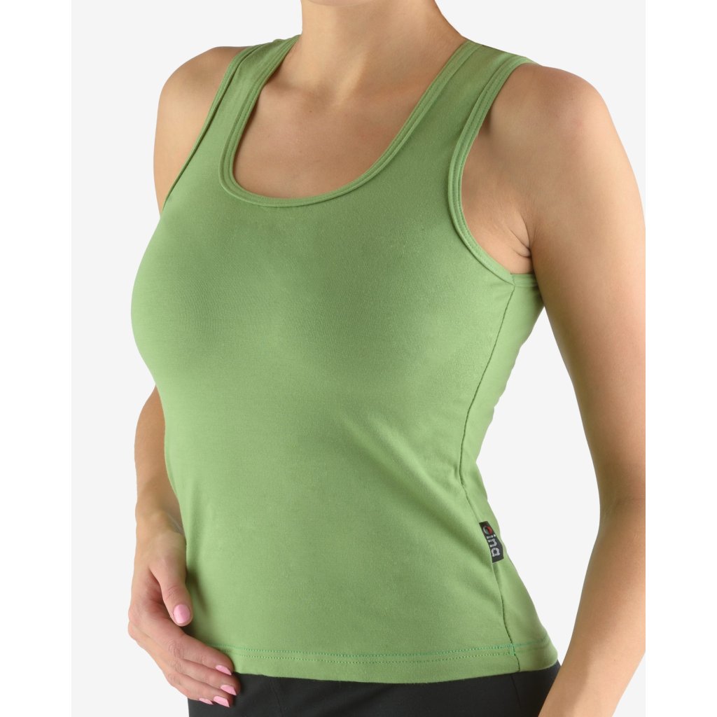 Tílko do pasu se širšími ramínky, dámské šité sportovní prádlo. Průramky a průkrčník jsou začištěny lemovacími proužky. Tílko je jednobarevné. V bočním kraji je všité logo. Materiál je vyroben z bavlny, která je doplněna Lycrou. Úplet je vhodný pro všechny, kteří hledají přírodní materiály. Lycra přidává materiálu pružnost a zlepšuje jeho tvarovou stálost. Prádlo z tohoto materiálu je vhodné pro každodenní nošení.