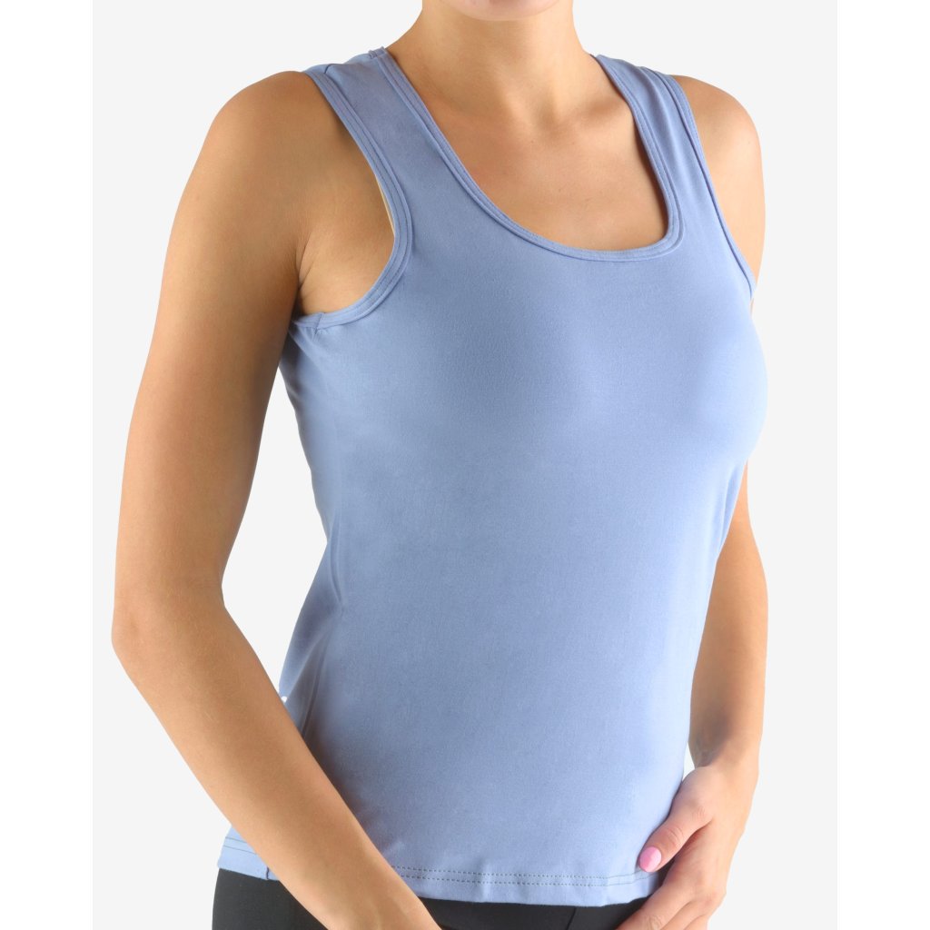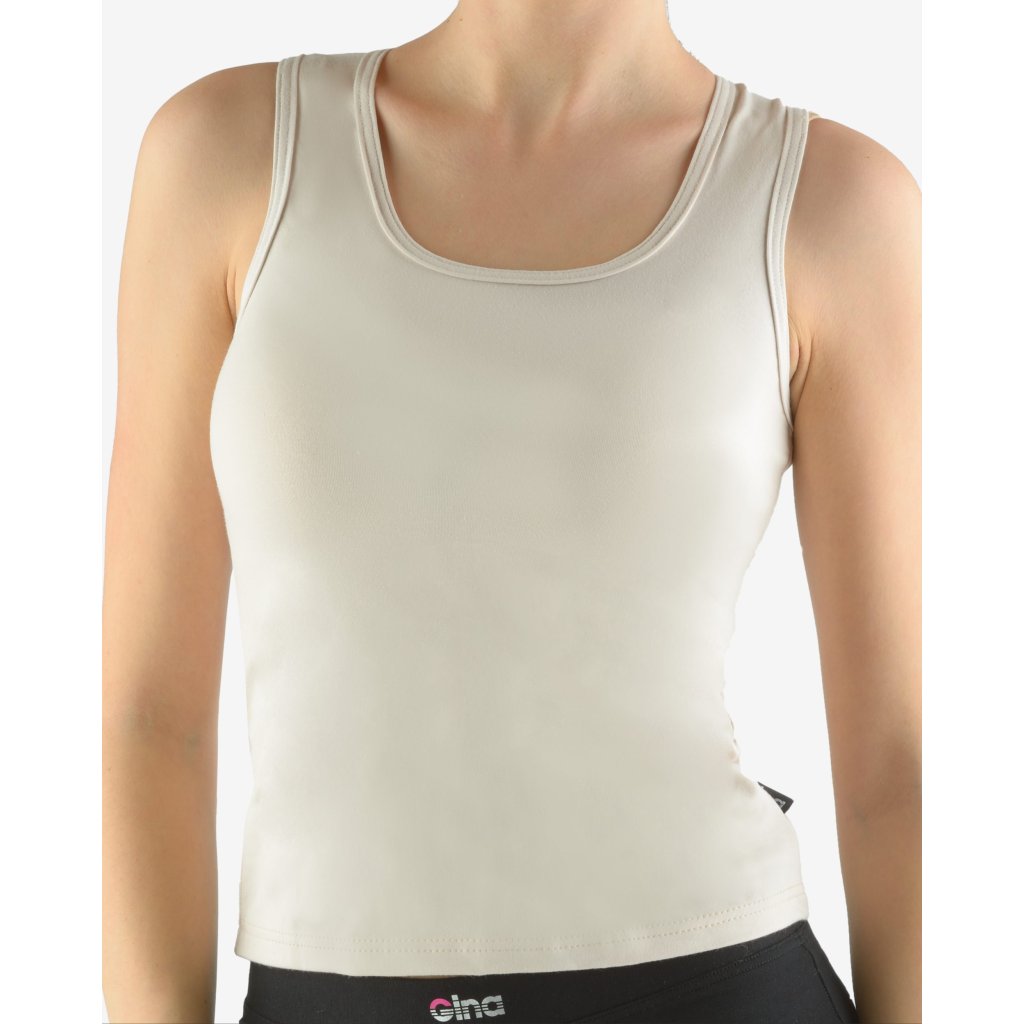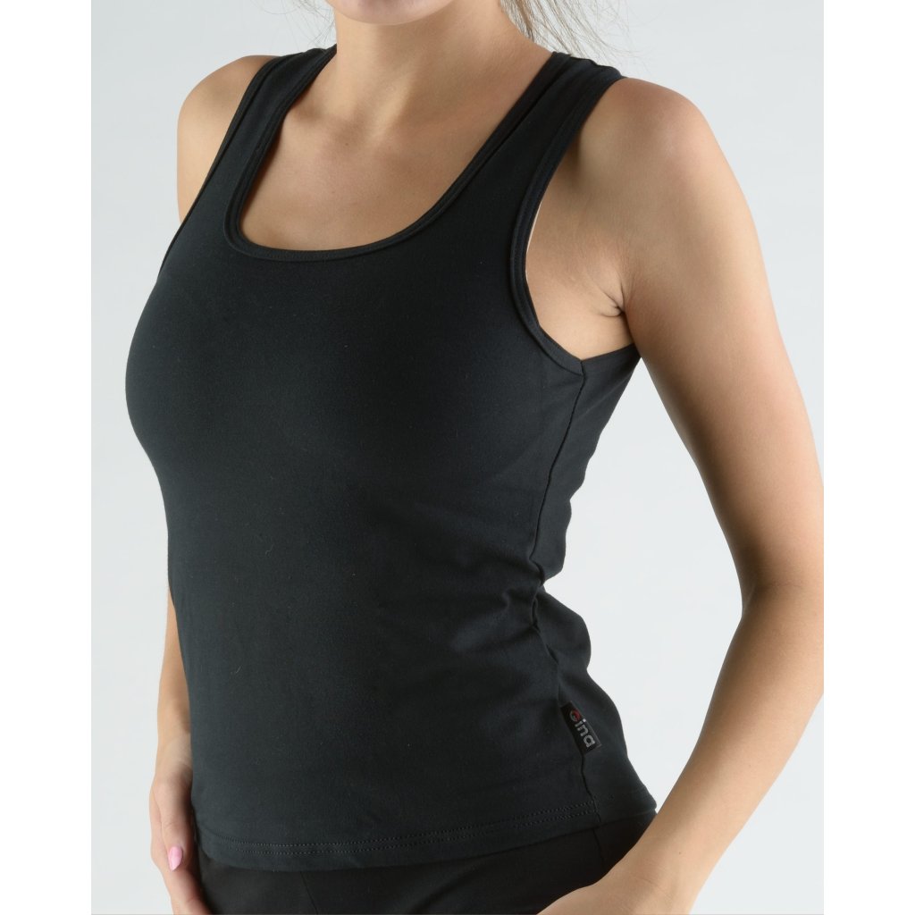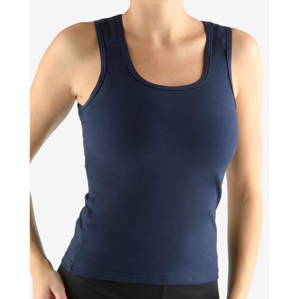 Tílko do pasu se širšími ramínky, dámské šité sportovní prádlo. Průramky a průkrčník jsou začištěny lemovacími proužky. Tílko je jednobarevné. V bočním kraji je všité logo. Materiál je vyroben z bavlny, která je doplněna Lycrou. Úplet je vhodný pro všechny, kteří hledají přírodní materiály. Lycra přidává materiálu pružnost a zlepšuje jeho tvarovou stálost. Prádlo z tohoto materiálu je vhodné pro každodenní nošení.