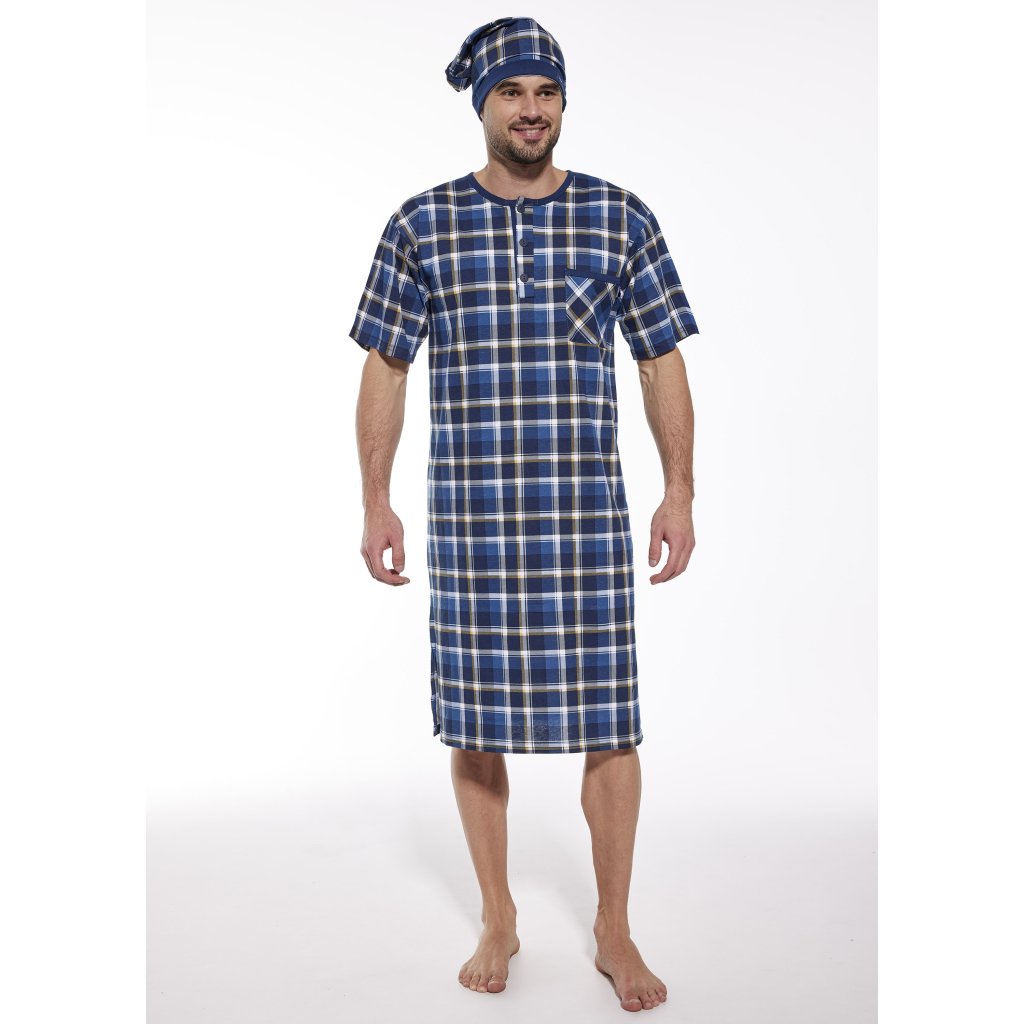 Pánská noční košile s krátkým rukávem. Vyrobeno ze vzorované bavlny, kulatý výstřih se zapínáním na tři knoflíky. V balení noční čepice. Složení: 100% bavlnaDoplňkové parametry