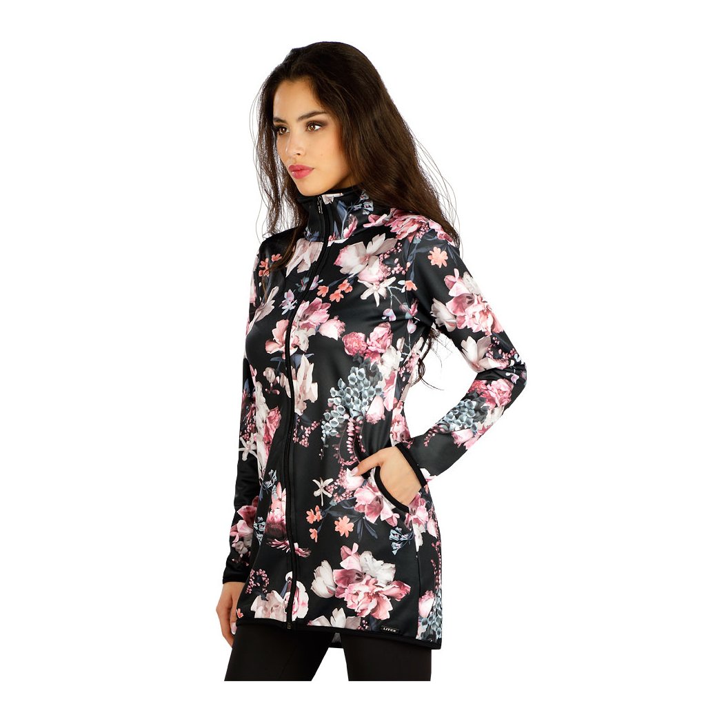 Stoják s vnitřním počesem. Zapínání na zip. Praktické boční kapsy. Výrobky z polyesterových vláken velmi dobře drží tvar, mají výborné termoizolační vlastnosti, jsou prodyšné a lehké. Jejich údržba je velmi snadná. Pružný materiál v krásném květinovém tisku s příjemným vnitřním počesem. Délka mikiny cca 80 cm. 100% Polyester tisk + černá S, M, L, XLDoplňkové parametry