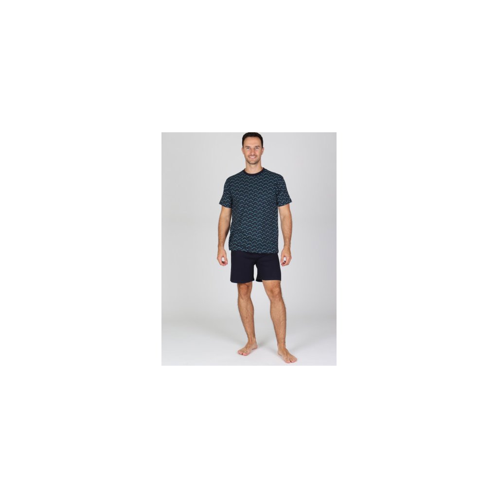 Pánské krátké pyžamo P RAVI si na spaní zamilujete. Pohodlné bavlněné pánské krátké pyžamo se skládá z trika s drobným potiskem a krátkých kalhot.