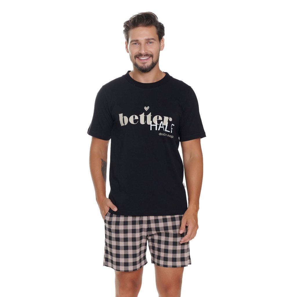 Pyžamo je vyrobené ze 100% bavlny, je příjemně prodyšné a kvalitně zpracované. Pyžamový vršek má černou barvu a potisk vepředu s nápisem Better half. Výstřih má kulatý tvar a rukávy jsou krátké.