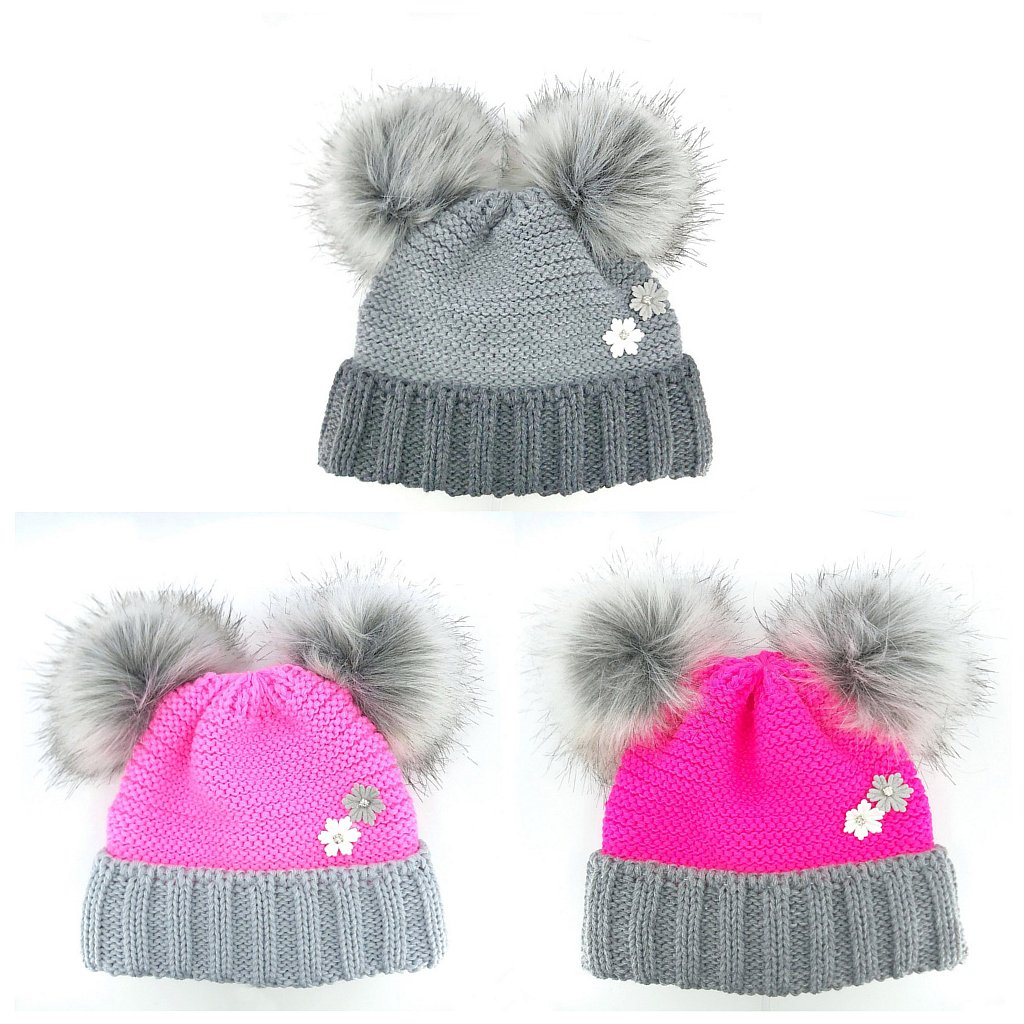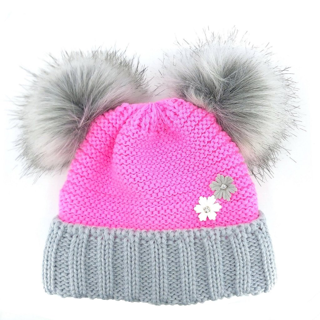 - dívčí pletená čepice s 2 bambulemi, zdobená aplikacemi ve tvaru kytiček, s kamínky, vnitřní strana mikrofleece