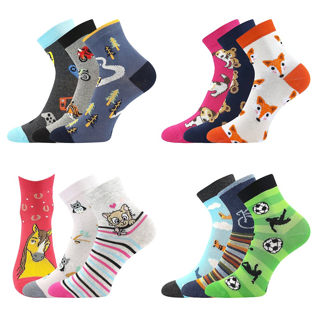 Dětské slabé ponožky Boma® KAY jsou plné krásných barevných a veselých obrázků. Potěšte vaše děti hravými motivy pro slečny i mladé pány, vybere si každý. Ponožky jsou středně vysoké nad kotník, mají měkký pružný lem a řetízkovanou špici, která netlačí. Vhodné na celodenní nošení. Veselé ponožky prodáváme v mixu.