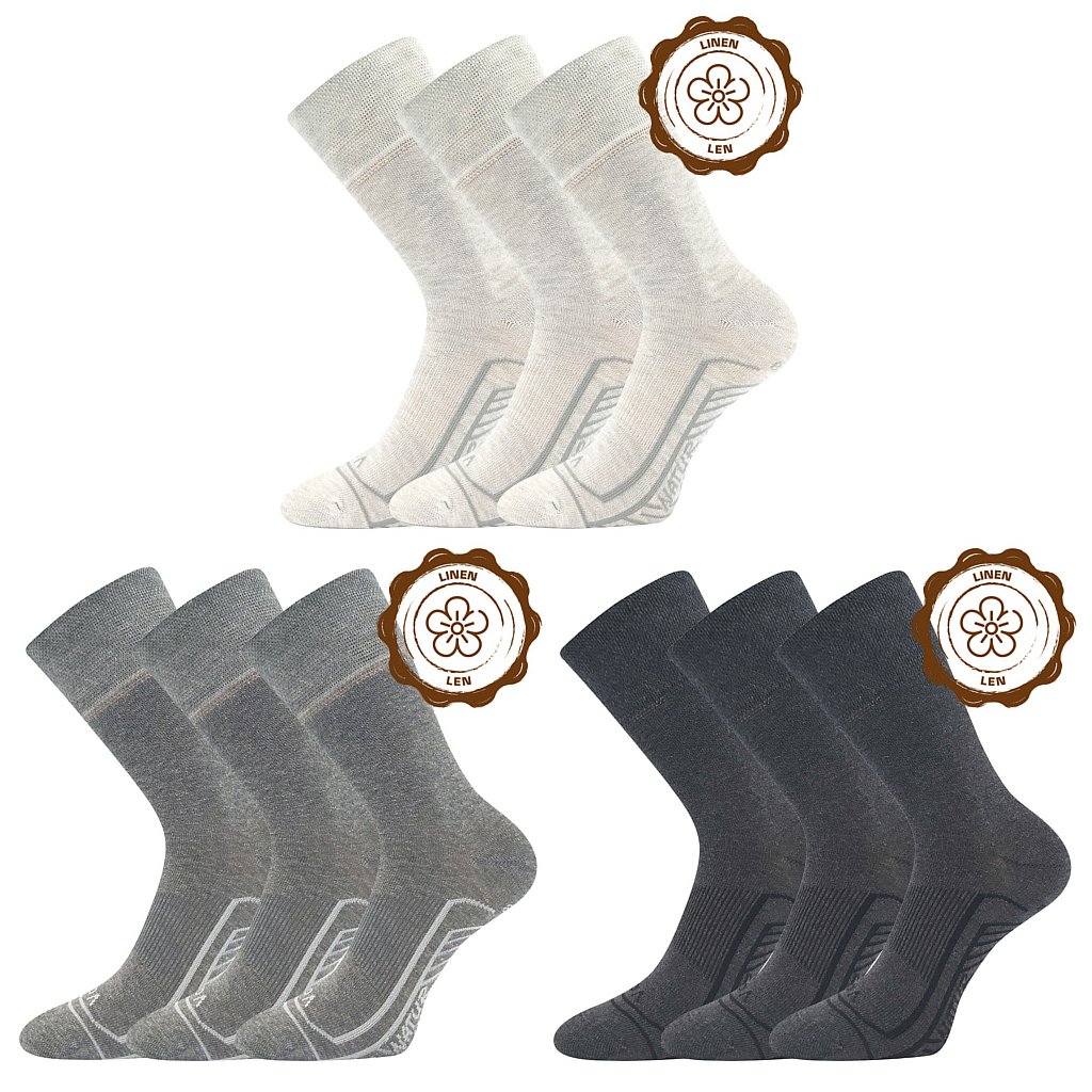 Klasické volnočasové ponožky VoXX® LINEMUL užijete po celý den. Kombinace pružného elastanu, bavlny a lnu činí tyto ponožky jedinečným prvkem v naší nabídce ponožek. Odolné ponožky jsou vysoce prodyšné, řetízkovaná špice nikde netlačí a zajišťuje pohodlí a komfort při nošení, jemný lem nohu nestahuje a elastická zóna po obvodu nártu zabraňuje přetáčení ponožky v obuvi. Slabé ponožky mají teplotní třídu A - od +10°C do +35°C