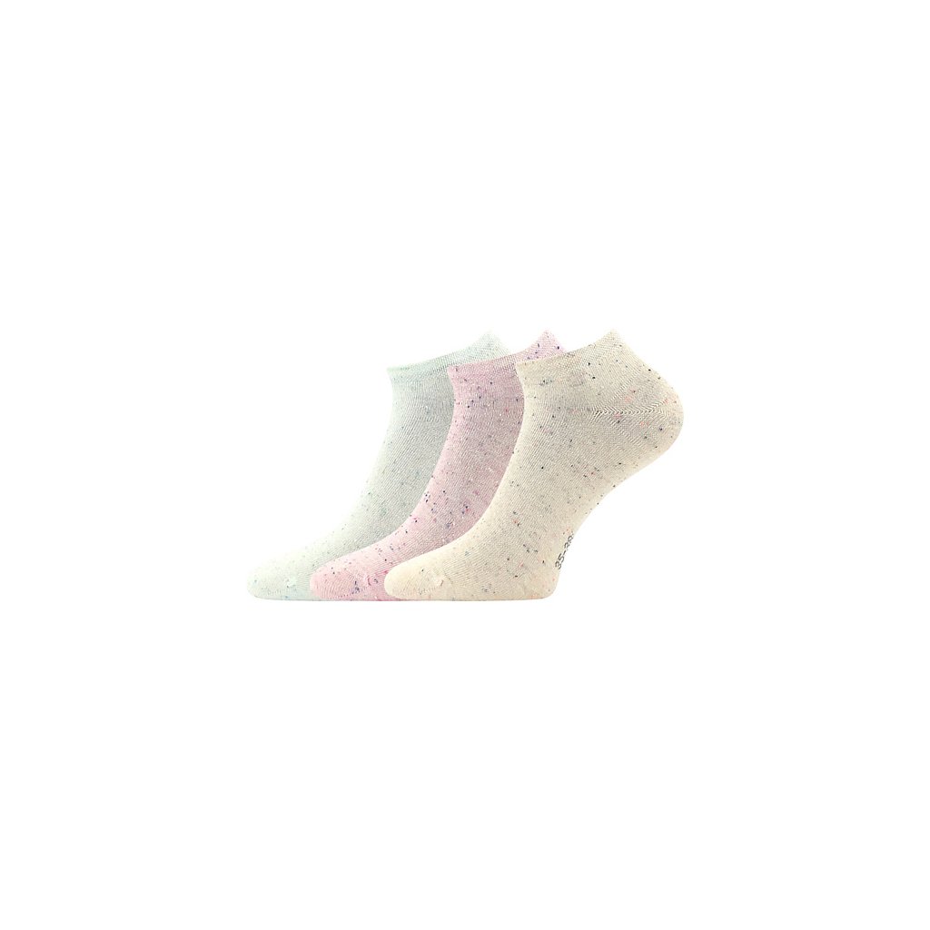 Dámské letní ponožky Lonka® NOPKANA jsou pletené z bavlněné nopkové příze doplněné o pružný elastan. Ponožky jsou tedy příjemné na omak, dobře pohlcují vlhkost a výborně se nosí. Krátké ponožky pod kotník mají nestahující lem a špičku uzavřenou náročnějším řetízkováním, díky kterému je spoj dokonale hladký a nehrozí, že ponožka bude tlačit. Pata je formována do tvaru Y, kopíruje tak přirozeně anatomický tvar, lem je volný a nestahující. Ponožky jsou dostupné ve výhodném balení 3 párů v mixu barev.