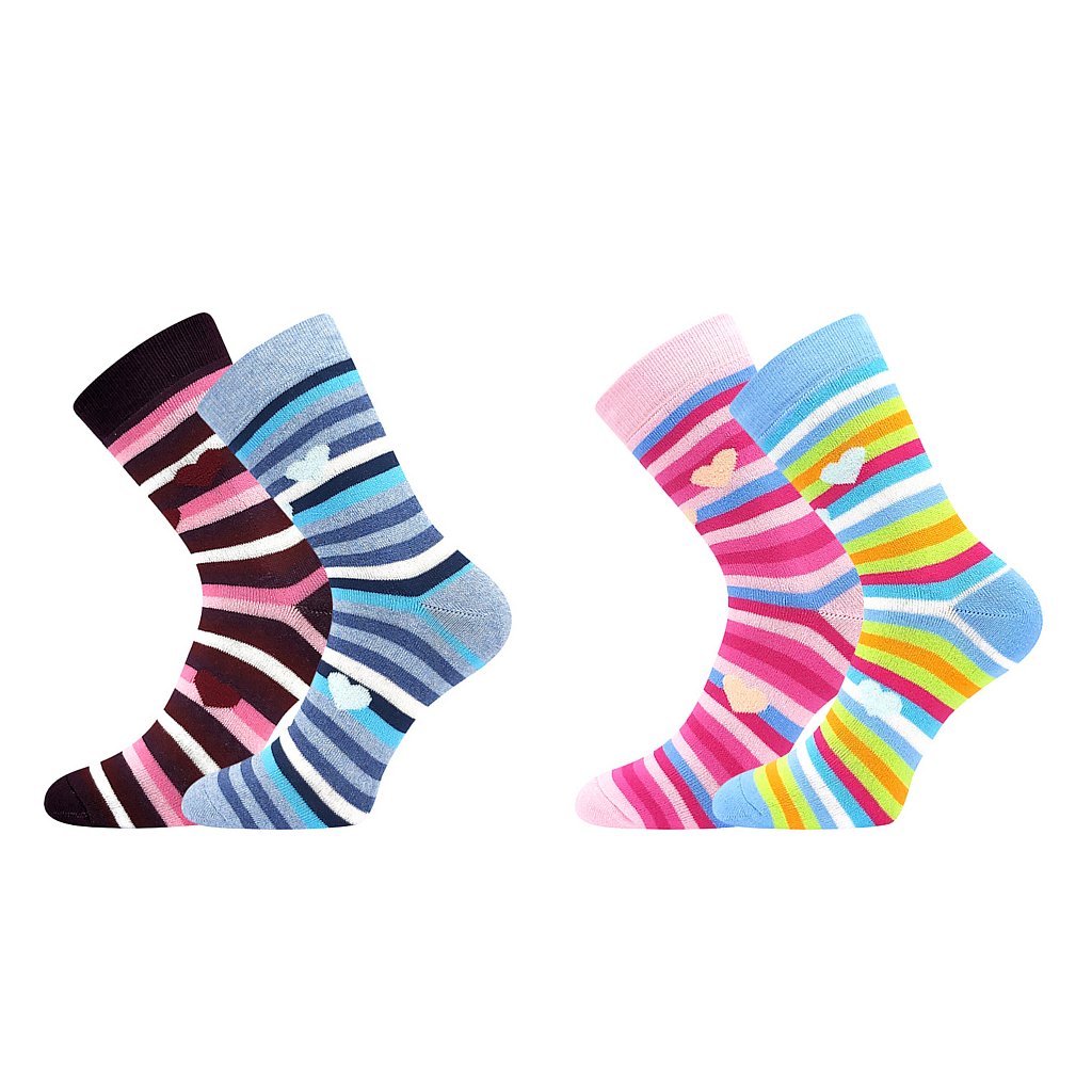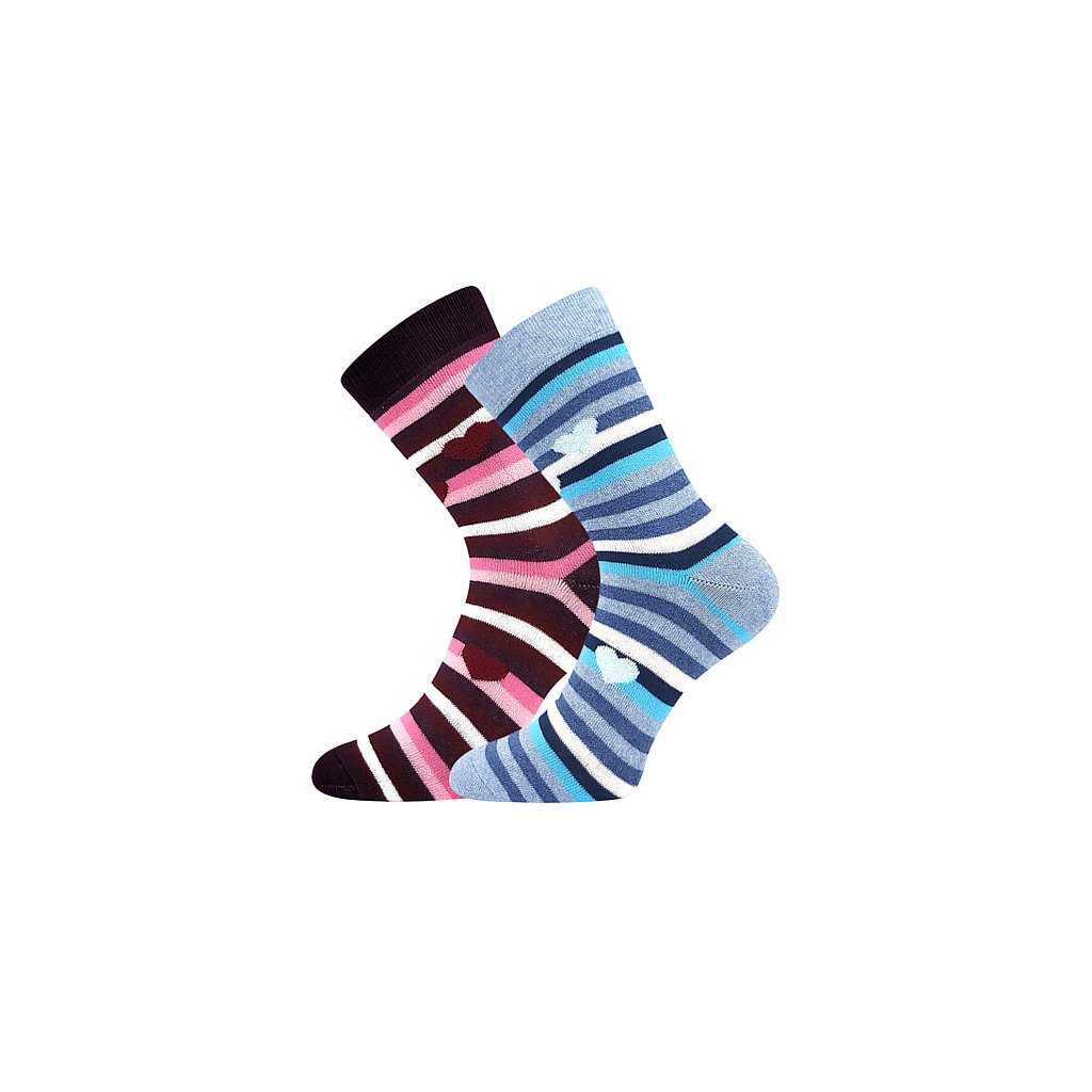 Dámské silné ponožky Boma® PRUHANA 2 s jemného froté s vysokým podílem bavlny a pružného elastanu. Díky tomu jsou ponožky jemné na omak, příjemné na nošení, dobře pohlcují vlhkost a zároveň dobře drží na noze. Teplé ponožky jsou z jemného a měkkého froté, jsou tak velice příjemné, vhodné na běžné nošení v chladných a sychravých dnech. Barevné pruhy doplňují něžná srdíčka. Dostupné ve výhodném balení 2 párů v mixu barev.