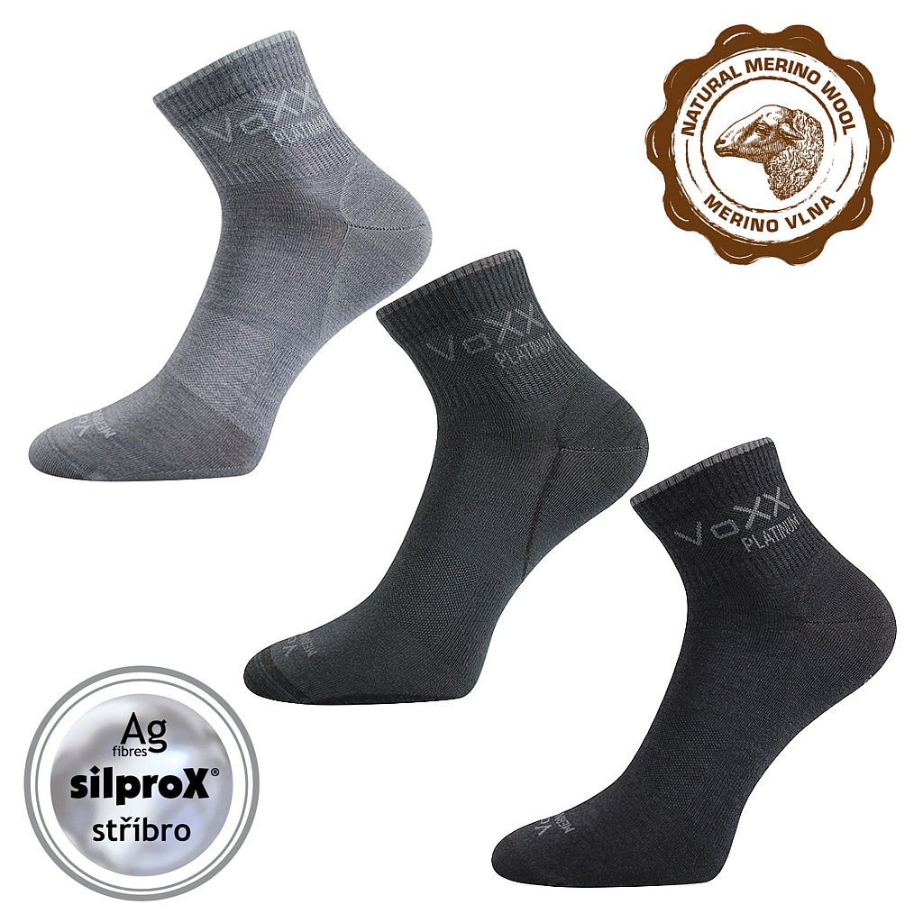 materiály: | vlna Merino - extra jemná ovčí vlna, jemný až hedvábný omak, termoregulační schopnosti, elastické, prodyšné, antibakteriální účinky, silproX® - speciálně vypředené polypropylenové vlákno s obsahem iontů stříbra, zabraňující vzniku zápachu a plísním |