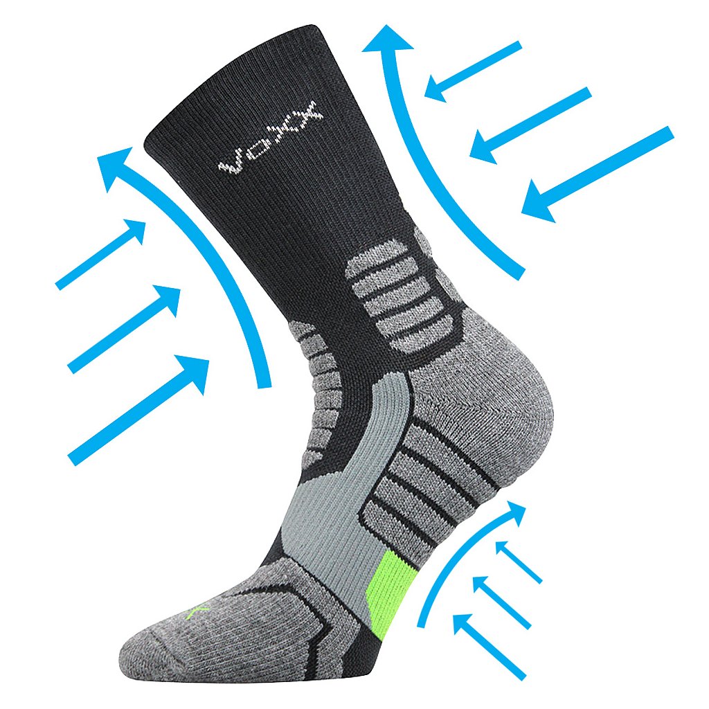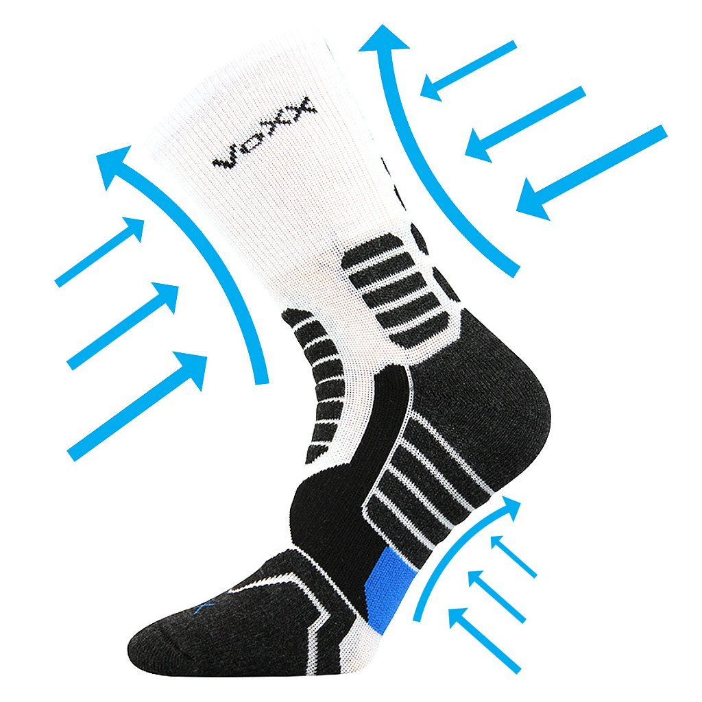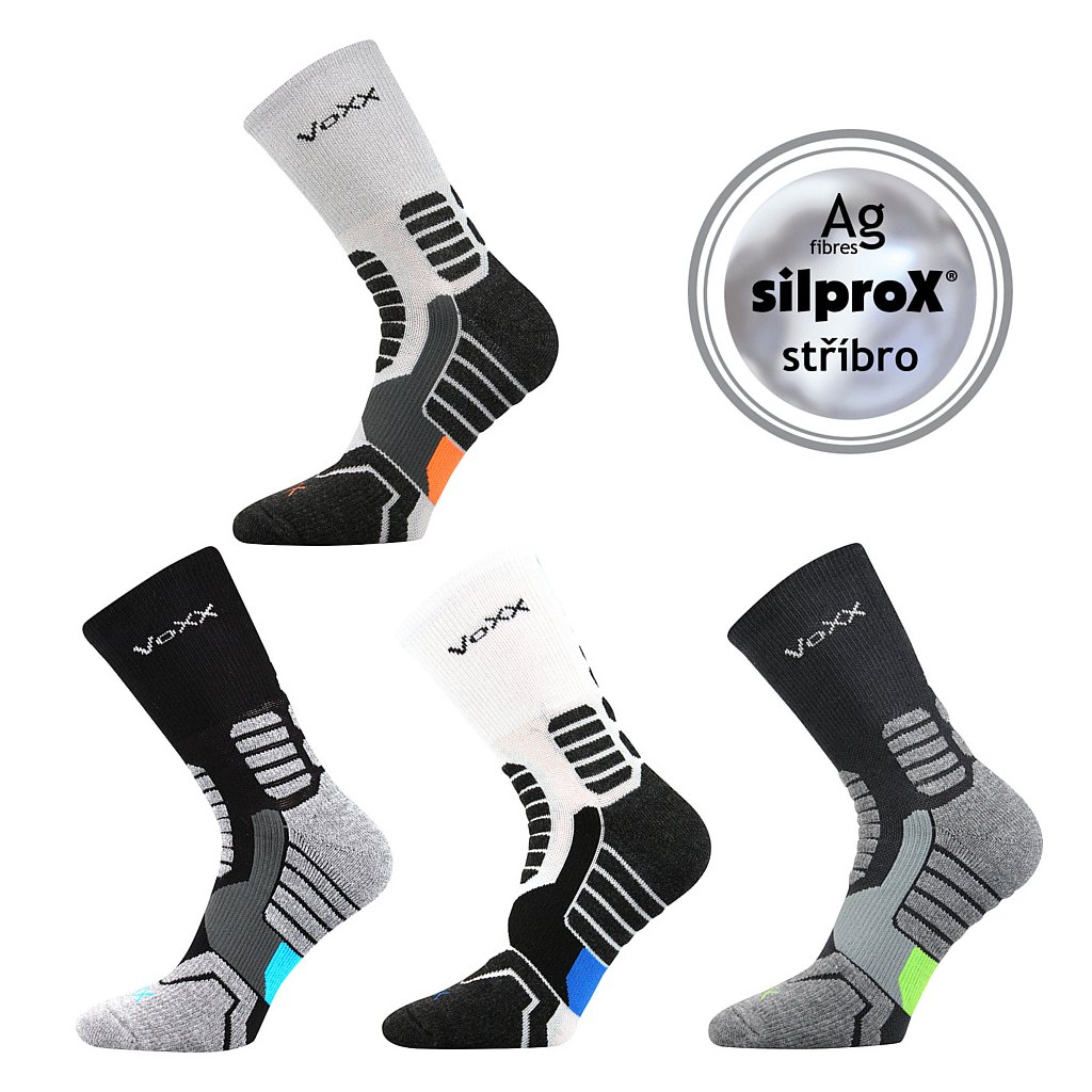 - dámské-pánské sportovní ponožky, kompresní, napomáhají pevnějšímu držení a vyšší stabilitě kotníku, se speciální konstrukcí proti posunu v botě, anatomicky tvarované a polstrované zóny chrání nohu proti otlakům a puchýřům, antibakteriální ochrana ionty stříbra v materiálu silproX, teplotní třída: B
