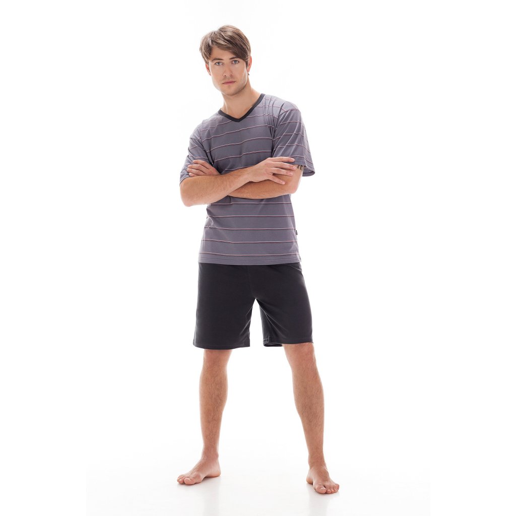 Pánské pyžamo vyrobené z vysoce kvalitní bavlny. Tričko s krátkým rukávem, barevné pruhy, výstřih do V. Šortky hladké, jednotné barvy odkazující k celému pyžamu. Dostupné barvy: tmavě modrá, grafitová, šedá - náhodně vybrané.Doplňkové parametry
