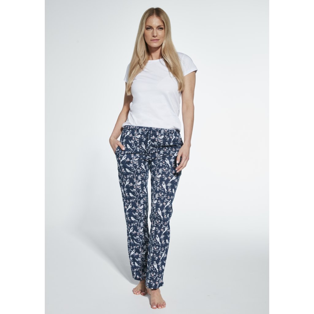 Pohodlné dámské kalhoty na spaní, vyrobené z kvalitní vzorované bavlny. Dlouhý elastický pas lemovaný bavlnou. Kapsy ve výšce boků. Složení: 100% bavlna