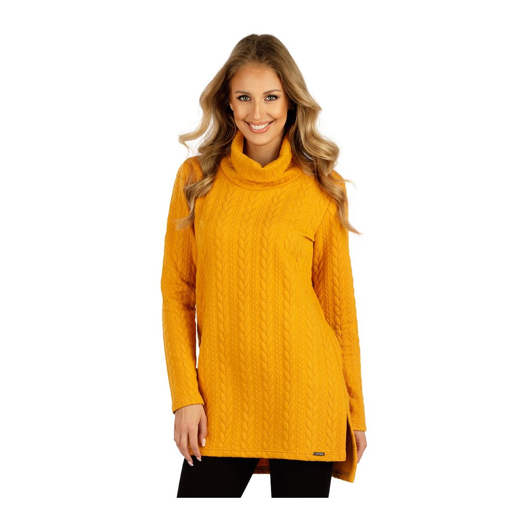 Vysoký spadlý rolák. Delší zadní díl. Na bocích rozparky. Mikinový úplet s plastickým vzorem oblíbených copánků je pružný, silnější materiál, který Vás zahřeje a je praktický na údržbu. Délka tuniky cca 75 cm. 81% Polyester + 16% Viskóza + 3% Elastan 189 hořčicová S, M, L, XLDoplňkové parametry