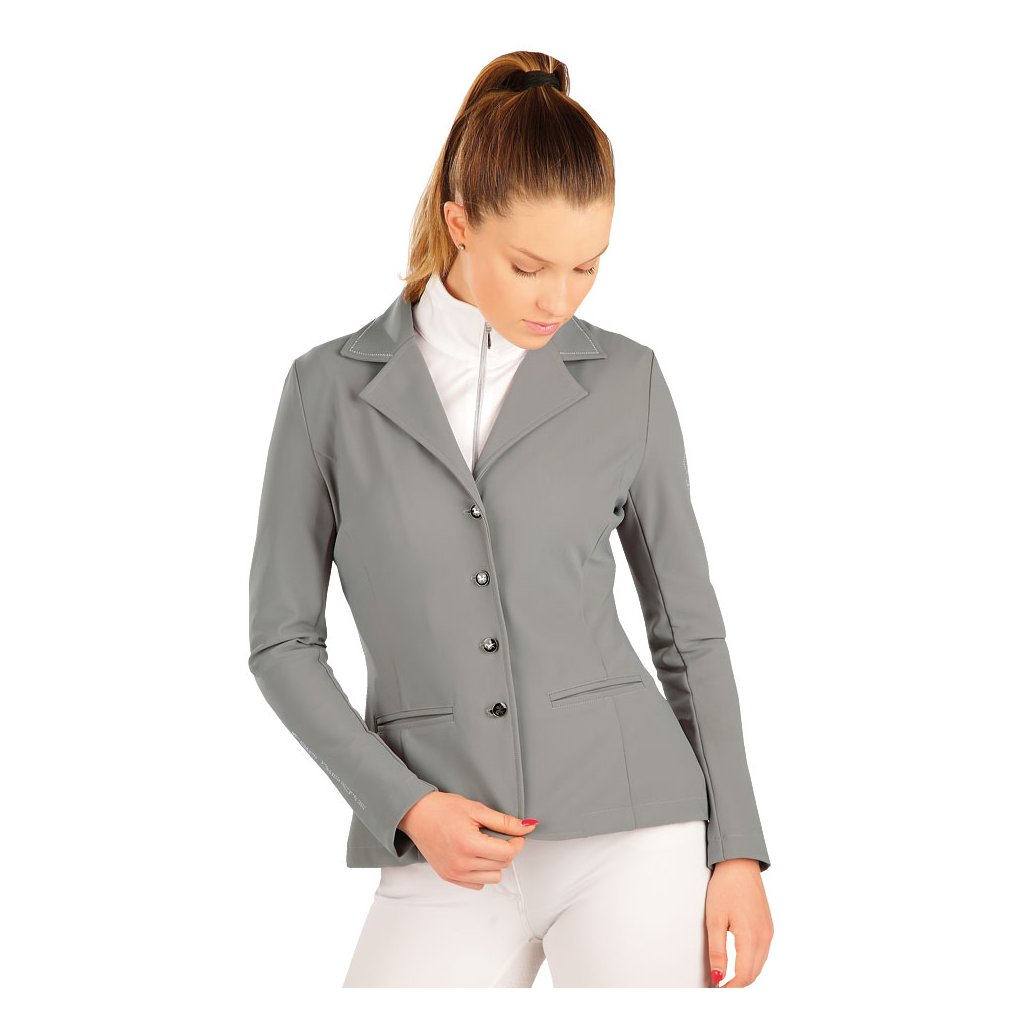 Zapínání na ozdobné knoflíky. Fazonový límec s kamínky. Výpustkové kapsy. Na zadním díle rozparky. Ozdobné kamínky. Materiál je velmi pružný a perfektně se přizpůsobí pohybu. Zároveň je velmi prodyšný, tvarově stálý a odolný proti oděru. 73% Polyamid + 27% Elastan/Lycra 111 světle šedá + stříbrné kamínkyDoplňkové parametry