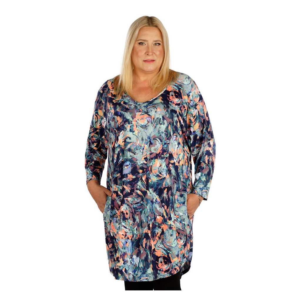 Volný střih s výstřih do V a praktické boční kapsy. Viskózový materiál je pružný, tvarově stálý a velmi příjemný na těle. Odstíny modré s rozjasňující lososovou barvou Vám dodá sportovně elegantní styl. Šaty nabízíme ve větších velikostech. Délka šatů cca 100 cm. 95% Viskóza + 5% Elastan tisk XL, XXL, XXXLDoplňkové parametry