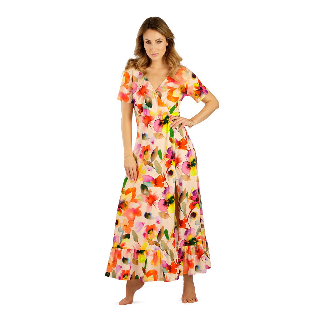 Romantický střih dlouhých šatů ke kotníkům s výstřihem do V. Rozparek na předním díle a našitý volán v délce šatů. Květinový potisk v překrásných barvách. Bavlněný úplet s příměsí elastanu zaručuje příjemný pocit při nošení. Velmi nápaditý kousek, který stylově osvěží Váš letní šatník. Délka šatů cca 135cm. 93% Bavlna + 7% Elastan Tisk S, M, L, XLDoplňkové parametry