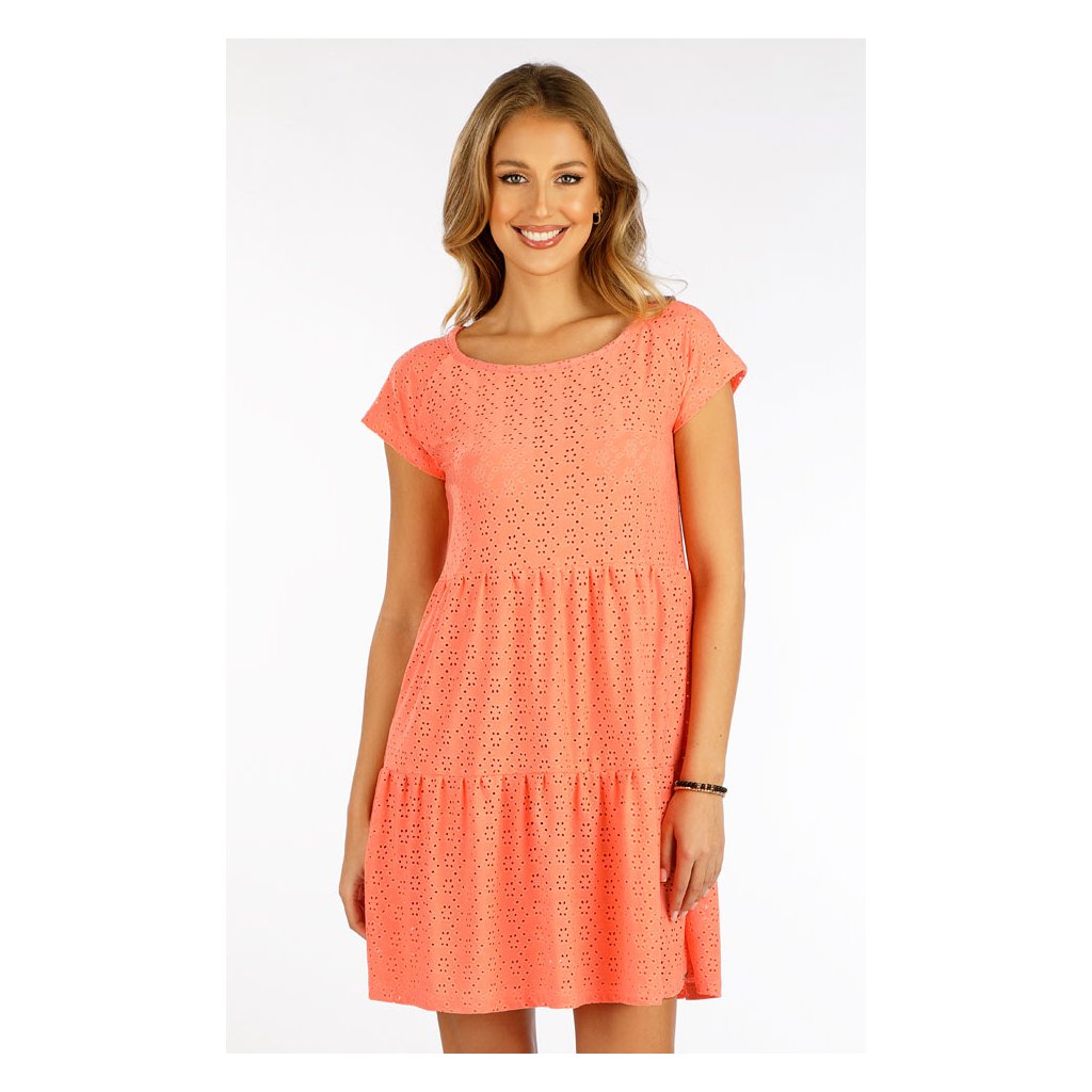 Elegantní volné dámské šaty s kanýry a délkou nad kolena. Působivý děrovaný vzor dodává šatům nezaměnitelný styl a šarm. Materiálové složení zaručuje dokonalou prodyšnost, maximální komfort při nošení a jednoduchou údržbu. Velmi stylový a komfortní kousek, který dokonale podtrhne Vaši ženskost. Délka šatů cca 85 cm. 95% Polyester + 5% Elastan 304 lososová S, M, L, XL