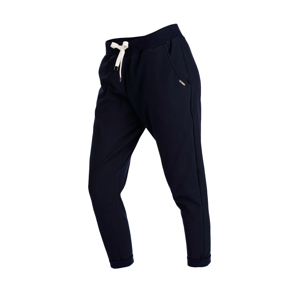 V pase pružný lem a bílá tkanice se stříbrnými koncovkami na případné stažení. Praktické boční kapsy. Délka nohavic s ozdobným ohrnutím. Bavlna s příměsí elastanu poskytuje maximální komfort při nošení. Materiál je měkký a příjemný na omak. Tyto kalhoty výborně doladí Váš sportovně elegantní oufit. 70% Bavlna HEAVY + 22% Polyester + 8% Elastan 514 tmavě modrá S, M, L, XLDoplňkové parametry