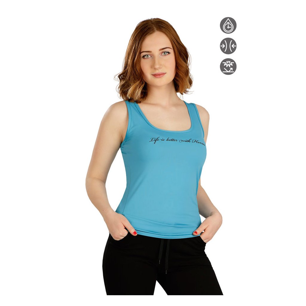 Dámské tílko v přiléhavém střihu. Na předním díle černý potisk. Materiálové složení zaručuje vysoký komfort a pohodlí po celou dobu nošení. 85% Polyamid + 15% Elastan/ Lycra 613 světle petrolejová S, M, LDoplňkové parametry