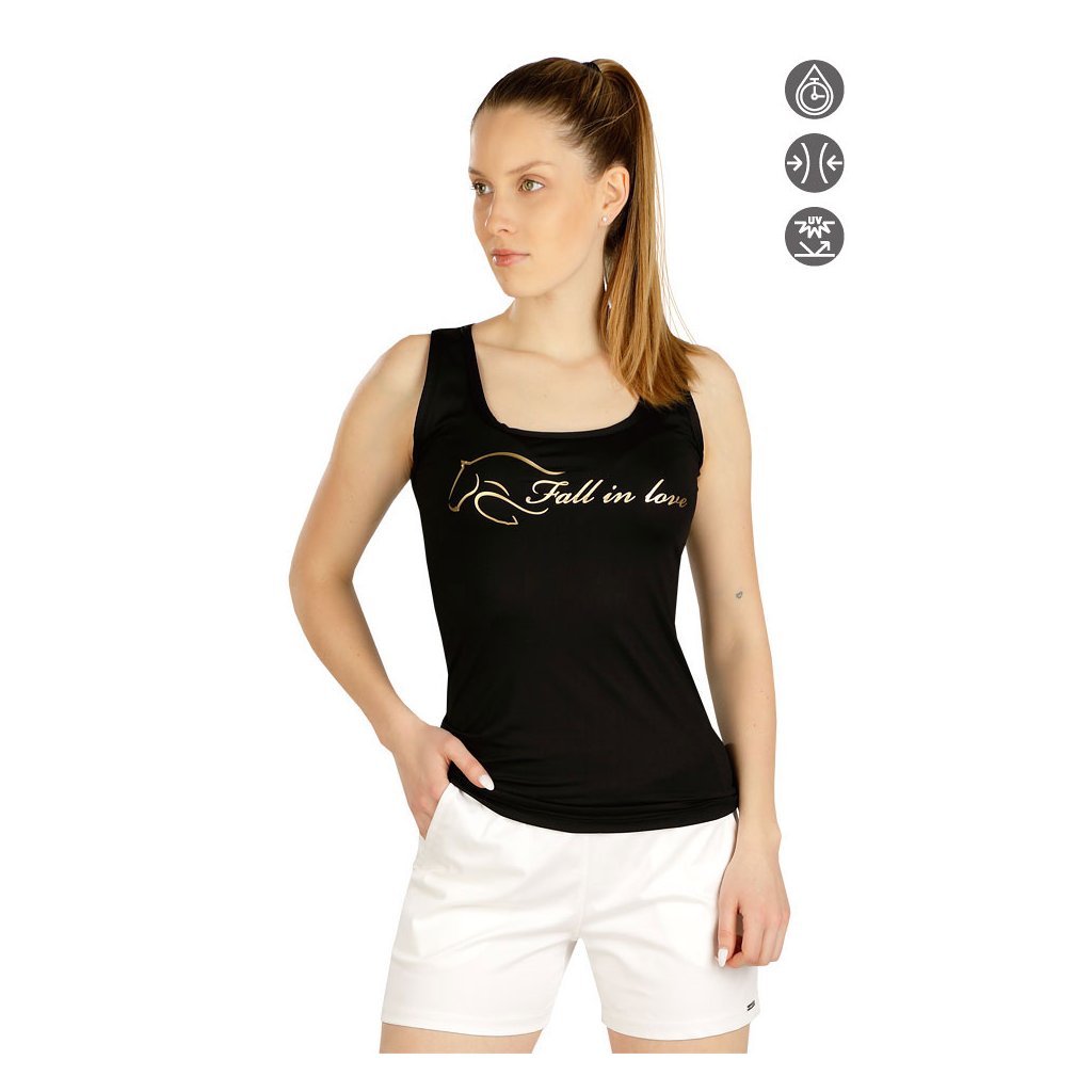 Dámské tílko v přiléhavém střihu. Na předním díle zlatý potisk. Materiálové složení zaručuje vysoký komfort a pohodlí po celou dobu nošení. 85% Polyamid + 15% Elastan/ Lycra 901 černá S, M, LDoplňkové parametry