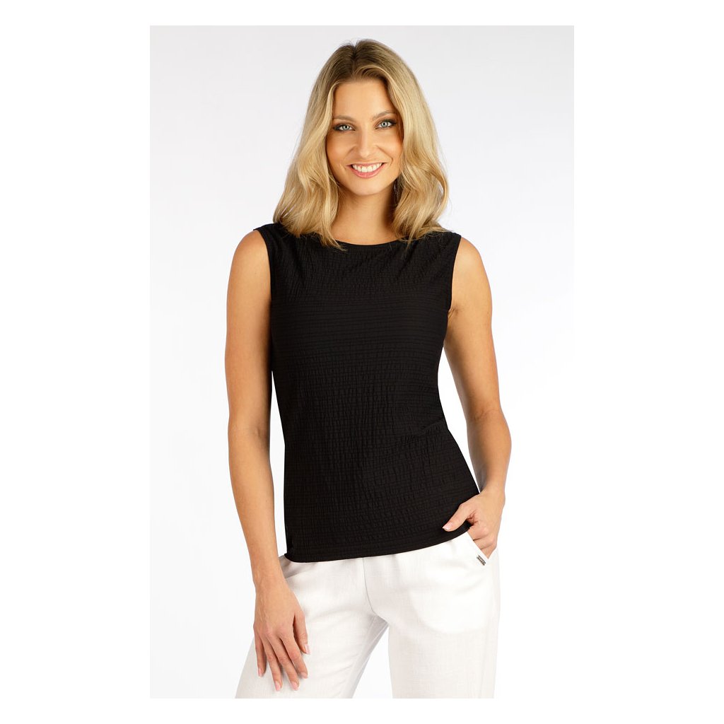 Triko přiléhavého střihu s lodičkovým výstřihem. Materiál je lehký s jemně mačkanou strukturou. Velmi praktický kousek, který stylově osvěží Váš letní šatník. 97% Polyamid + 3% Elastan 901 černá S, M, LDoplňkové parametry