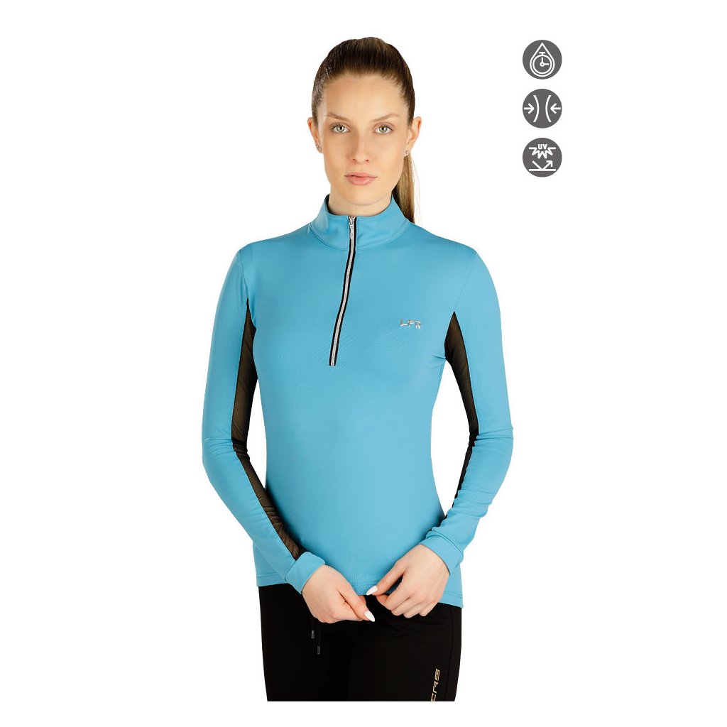 Dámské triko s dlouhým rukávem. Elegantní propracované triko se stojáčkem a krátkým stříbrným zipem. Rukáv kombinovaný se síťovinou na vnitřní straně a LFR logo. Materiál je velmi lehký, příjemný na těle a jemný na dotek. Zaručuje komfort a pohodlí po celou dobu nošení. 85% Polyamid + 15% Elastan/ Lycra 613 světle petrolejová S, M, LDoplňkové parametry