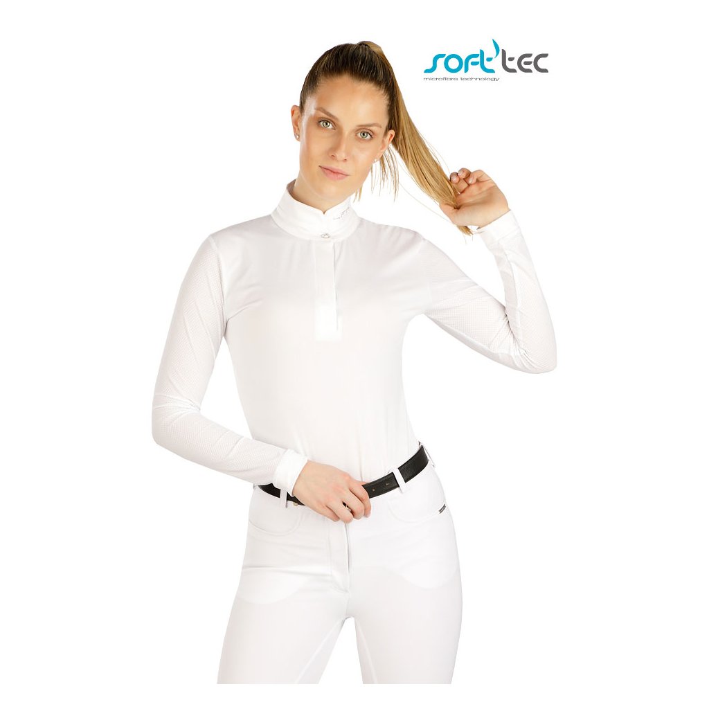 Dámské závodní triko s dlouhým rukávem. Stojáček je ozdoben konoflíkem "Crystals from Swarovski". Léga se skrytým zapínáním na knoflíky. Rukávy jsou ze vzdušného elastického strukturovaného materiálu. Funkční materiál je vzdušný, splývavý, nemačká se a velmi rychle schne. 94% PES coolmax all season soft'tec + 6% Elastan/ 84% Polyester + 16% Elastan 100 bíláDoplňkové parametry