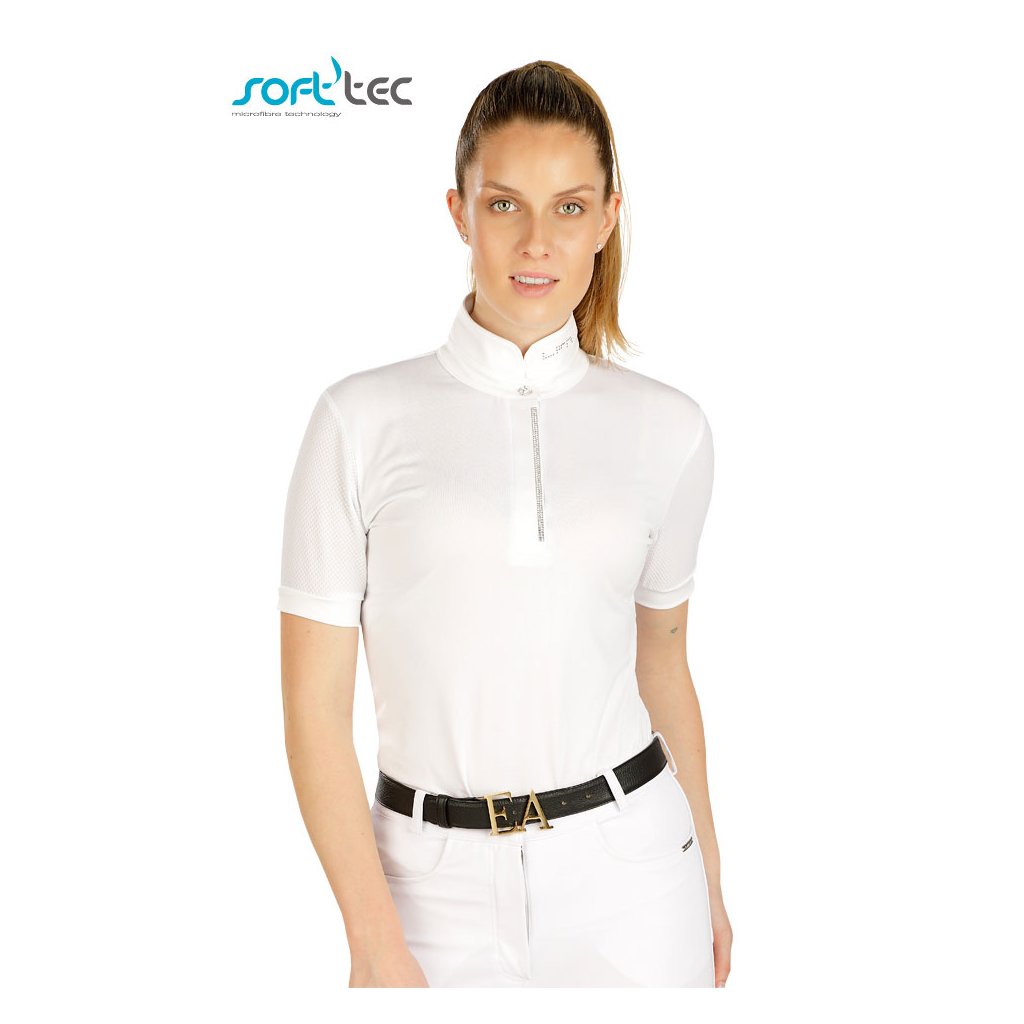 Dámské závodní triko s krátkým rukávem. Stojáček je ozdoben konoflíkem "Crystals from Swarovski". Léga se skrytým zapínáním na knoflíky a ozdobnými kamínky. Rukávy jsou ze vzdušného elastického strukturovaného materiálu. Funkční materiál je vzdušný, splývavý, nemačká se a velmi rychle schne. 94% PES coolmax all season soft'tec + 6% Elastan/Lycra / 84% Polyester + 16% Elastan 100 bílá